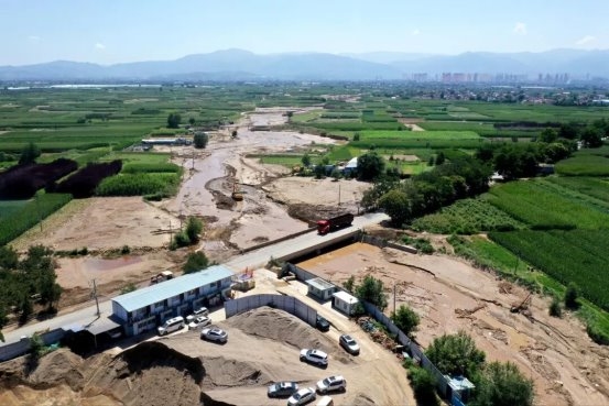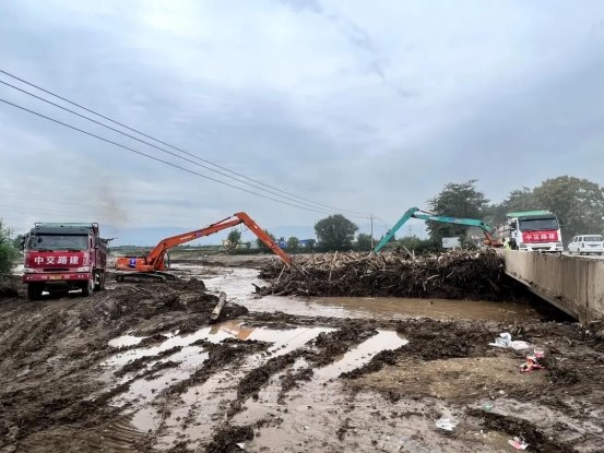 “通了!河道通了!”隨著最後壹塊阻礙行洪的斷木被清運上岸,甘肅省蘭州市榆中縣雙店子橋河道恢復了往日的暢通,阻滯的河水順著河道奔湧而下。中交路建百度智能雲(蘭州)數字經濟產業基地項目搶險隊員與村民們站在河堤上鼓掌歡呼,難掩激動與喜悅。雙店子橋成為全鎮首個“災痕清零”的河道節點,而這壹切,卻僅花費了35個小時。