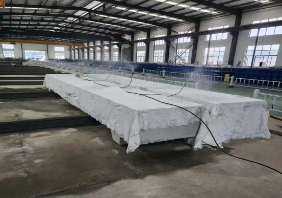 模塊化拼裝:模板澆築實現“高效量產” 預製場的模板安裝與混凝土澆築區,是裝配式蓋板涵質量與效率的關鍵所在。這裏采用臥式放置的定型鋼模,面板為不銹鋼復合型材質,底模與側模的拼接嚴絲合縫,無需額外封堵即可滿足澆築要求。“定型鋼模就像定製的‘模具’,不僅拆裝方便,還能保證每塊預製件的尺寸一致,結構表面平整光滑,大大減少了後期修補工作量。”手握扳手檢查拉桿螺絲的模板工老王,不時輕敲模板,憑借二十多年的經驗通過回聲判斷振搗是否密實。 混凝土澆築環節同樣彰顯精細化:混凝土由運輸車直接送入布料器入模,以附著式振搗為主、插入式振動棒為輔,振搗器移動距離嚴格控製在作用半徑的1.5倍以內,與模板保持5-10厘米距離,分層對稱澆築,每層厚度不超過30厘米。“倒角、腋角這些薄弱部位要重點振搗,直到混凝土不再下沈、無氣泡冒出、表面泛漿才算合格。”澆築現場,技術人員全程旁站監督,確保每個部位都振搗密實。 脫模與養護環節則為預製件質量“保駕護航”。按照規範要求,混凝土強度達到設計強度的85%以上方可拆模吊裝;脫模後的預製件經桁吊轉運至養生區,覆蓋土工布後開啟噴淋系統,通過溫濕計實時監測,保證連續7天飽水養護,確保混凝土強度穩步提升。