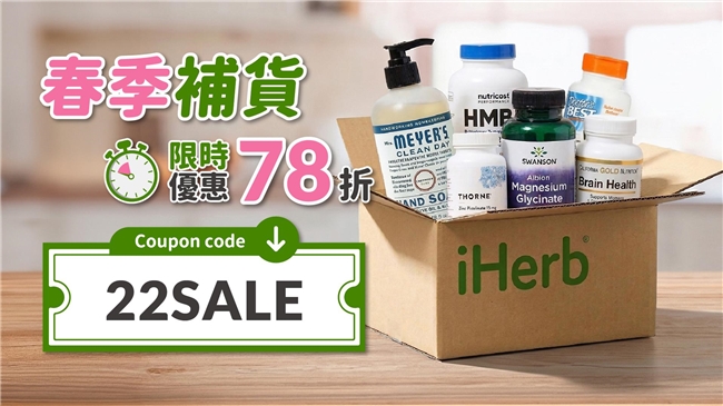 圖說:iHerb 提供多元健康商品,讓消費者輕鬆選購海外人氣好物。 限定折扣碼優惠 結帳享78折 除了商品推薦外,iHerb 也同步推出多項限時優惠活動。iHerb 表示,希望透過多元健康商品與跨境直送服務,讓消費者在換季時節也能輕鬆補充所需營養,同時為了感謝消費者長年支持,iHerb 在2026年春季期間,特別推出專屬香港消費者的超值優惠,4/10 至 4/24 期間於 iHerb 官網結帳輸入折扣碼「22SALE」,即可享 78 折優惠,把握春季補給時機,為日常生活注入健康能量。 iHerb:一站式全球健康選物店 總部位於美國加州的 iHerb,是全球領先的健康養生產品線上零售品牌。iHerb 最大的優勢在於提供香港消費者「不用找代購、不怕買到假貨」的安心管道。所有產品均由美國及亞洲物流中心直運,保證全站正品,並提供極致便捷的購物體驗: ●快速到貨: 下單後最快隔日可到貨。 ●免運優惠: 訂單滿 HKD300 即享免運服務。 從維生素、營養補充品到為家人準備的保健好物,現在正是趁手入的最佳時機,想買得聰明又安心,快到 iHerb 官網逛逛,別讓性價比高的好康從手邊溜走! 關於iHerb iHerb是來自美國全球知名的跨境電商平台,專注於提供高品質的保健食品、營養補充品、美妝個護及生活用品。全站超過 5 萬項精選商品,服務遍及 180 多個國家與地區,致力於讓全球消費者以合理價格購得健康與美麗的好選擇。所有產品皆由美國及亞洲多個先進物流中心直接出貨,並在全程冷鏈與溫控倉儲管理下保持產品新鮮度。iHerb 也持續強化多語言客服與在地支付方式,確保全球用戶都能享有安全、透明與便利的購物體驗。 |
